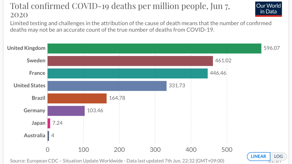 United Kingdom=イギリスは100万人あたりの死者数6/7の時点で596.07人です。これに対して日本は7.24人です。推移のグラフを見てもわかるように日本の数値は他国と比較して圧倒的に少ないためグラフの形が地を這うミミズのようになってしまっているという…。3月の中旬から下旬にかけてアメリカやイタリアの死者がうなぎ上りで増加していた時は、これはもしかして日本もヤバいのではないかと一瞬思いましたが欧米の国とグラフの傾きがまったく違うのを見て4月の頭頃には、ちょっと日本は違うなと考え直しました。多くの人が同じように気付いたはずだと思ったのですが現実は違いました。世間の多くの方はロックダウンや緊急事態宣言を求めました。そして4/7から5/25まで緊急事態宣言は続き経済活動は急激にブレーキをかけられ解除後もまだ自粛ムードがかなり残る中、多くの企業が倒産しており、生き残った企業も前年比大幅な業績ダウン、今後さらにこの影響による負の連鎖が続きます。深刻な事態が浮き彫りになるのはこれからだと思っています。たぶん夏のボーナスはコロナ前の成績で判断なので出る企業はあると思いますが冬のボーナスを出せる企業は減ると思っています。