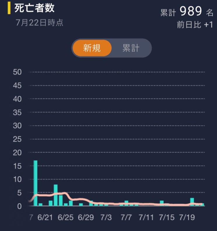 東洋経済ONLINEのグラフを参考にします。7月に入ってからは1日に数名の死亡者がいるかいないかという状況です、これは全国の統計です。7/10から7/13までと7/16から7/19までについては死亡者数0です。7月に入ってから22日までの死者数は16名です。これを見て私なんかは、いや、これもうただの風邪でしょ…と思っていますが皆さんはどう思うでしょうか。ちなみに死亡者数のピークは5/8の49名です、そして7/22までの累計で989人です。死亡者数の値は人口比で考えてアメリカは日本の50倍というレベルです。よって、あくまで「日本においては」ただの風邪ではないかという話です。
