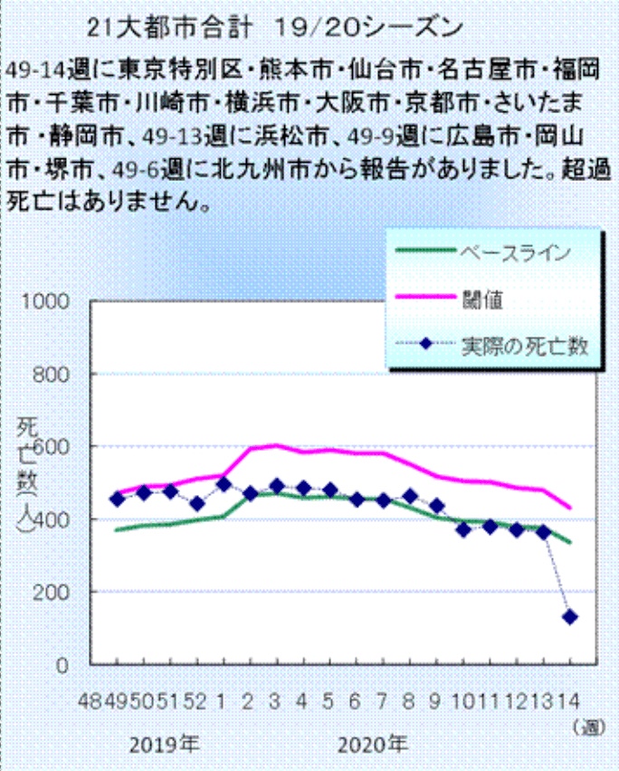 インフルエンザとの比較もしておきます。日本の東京や大阪含む21都市におけるインフルエンザによる死亡者数は2019年の12月から2020年の2月まで毎週400人を超えていました。3月もほとんどの週で400人程度の死亡者数です。これは新型コロナの騒ぎと並行して起きていたことですが、こちらはスルーされて報道はほとんどされていないのではないでしょうか。