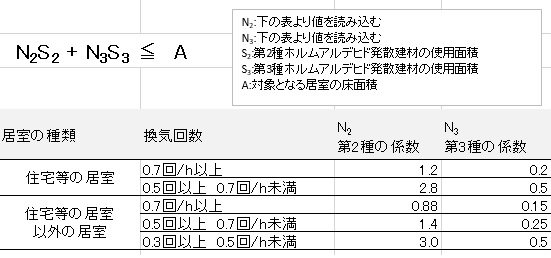 ただしF✩✩✩✩で作られた仕上材を使用した場合においても家具などからの発生が考えられるため下記の計算式で求めた居室の換気量を確保する必要があります。これがいわゆる24時間換気と呼ばれるものです。