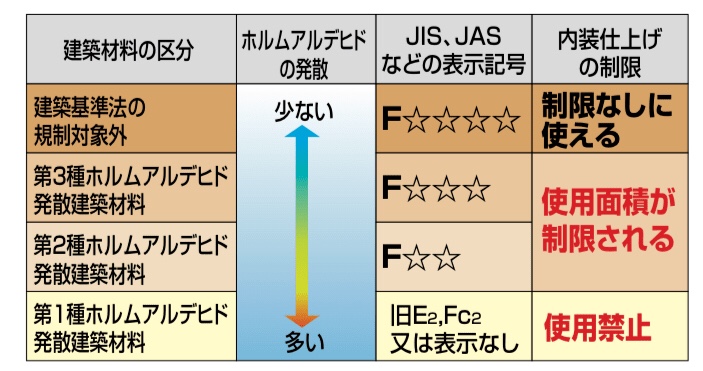 ホルムアルデヒドの発散量が0.005mg/m2 以下の場合はF✩✩✩✩(フォースターと呼んでいます)発散量が多くなるごとに星は減ります。最下クラスの第1種ホルムアルデヒド発散建築材料に関しては使用禁止、第2種と第3種は建材の使用面積が制限されます。
