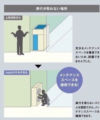 通常のマルチエアコンの室外機がマッシブな形状をしているのに対してmachiマルチはスリムな形状をしているので狭小スペースにも納めることができます。
