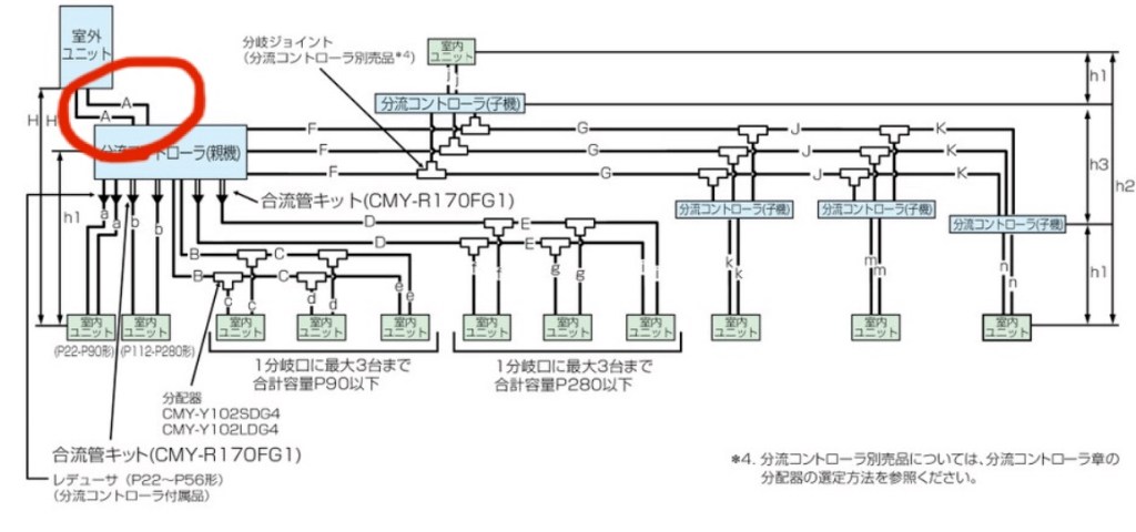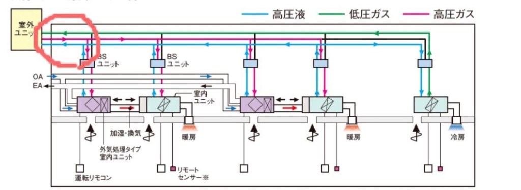 ダイキンの配管模式図の赤丸で囲った部分、ここは室外機から室内の冷媒の流れを制御するBSユニットまでのメイン管です。
