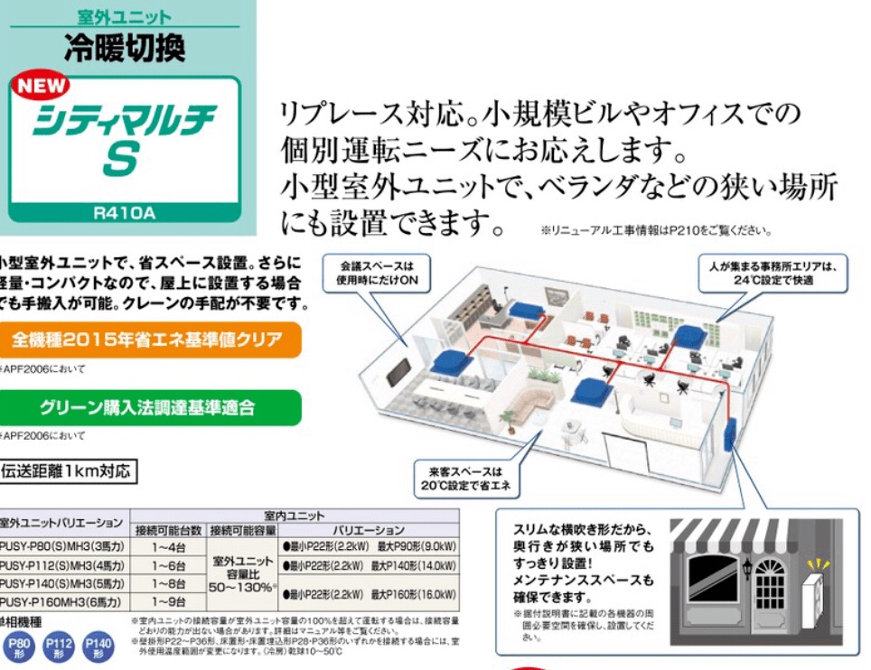 こちらもスリムな形状で狭小スペースに納まるのが売りですがダイキンのmachiマルチより能力選定のレパートリーが少ないのが難点