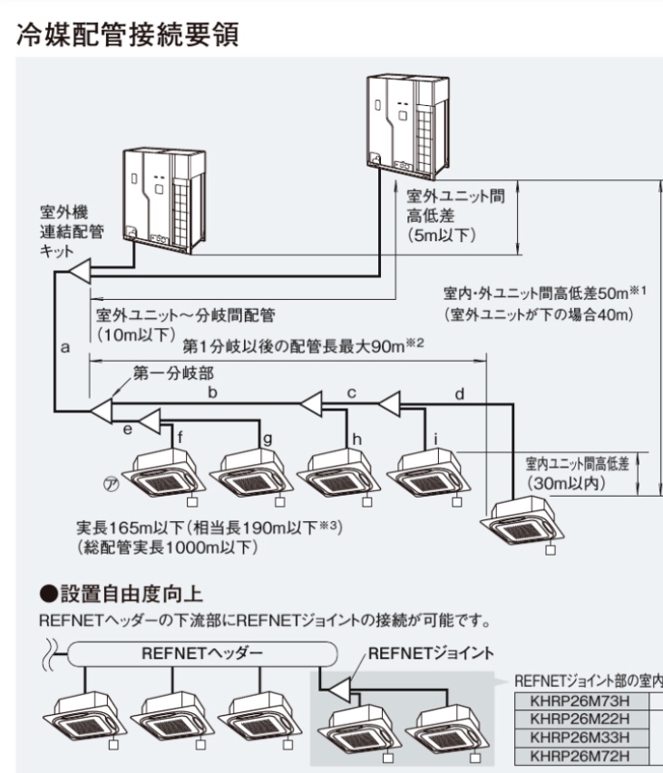 室外機から最遠の室内機までダイキン、三菱電機など90mまで施工可能、高低差は50mまで対応できます。