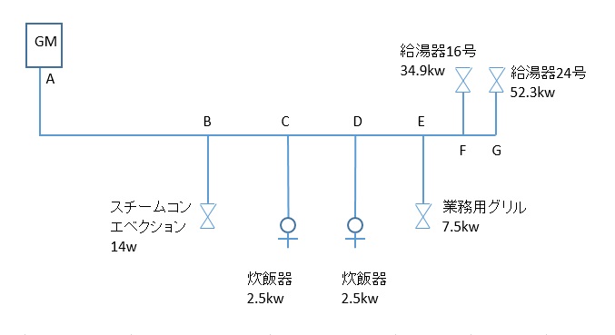 B-C間は ガス消費量合計99.7kwより上記と同様の計算でガス流量に換算すると8.37m3/h となります。