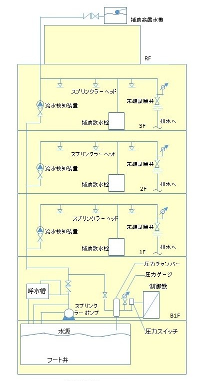 スプリンクラー設備は水源となる水槽、スプリンクラー用のポンプ、呼水槽、圧力チャンバー、制御盤、各階に設置される流水検知装置、スプリンクラーヘッド、末端試験弁、屋上に設置される補助高置水槽などで構成されます。