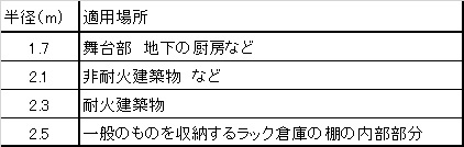 スプリンクラーヘッドは下記表の半径の円で建物内を包含できるように配置します。