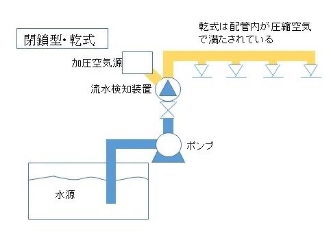流水検知装置の二次側は圧縮空気で満たされており、火災時に感熱開放して圧力が下がるとポンプから水が圧送され散水されます。