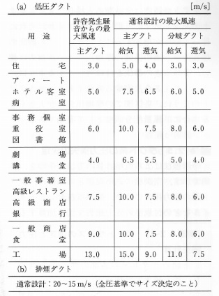 ダクト内風速については用途によって許容値があります。
