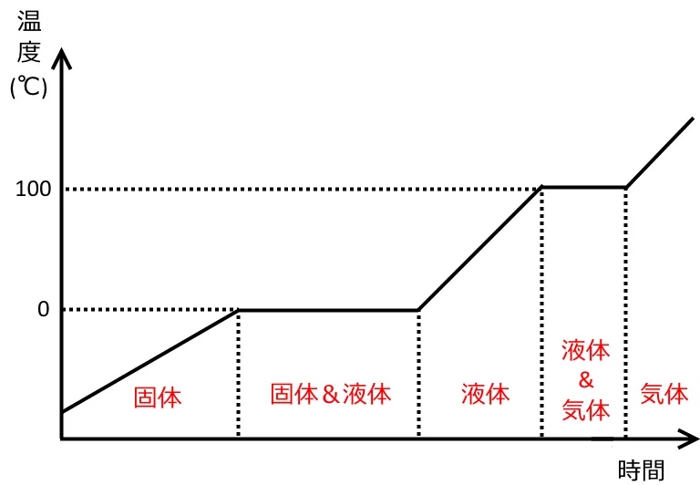 グラフが階段の踊り場のように水平になっている部分は氷が水へ、あるいは水が水蒸気へ状態変化してる最中であることを意味します。