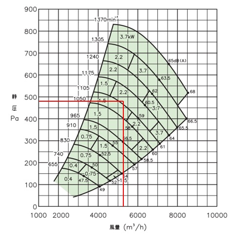 メーカーのカタログなどに線図があるので、線図に風量と静圧を書き込めば選定できます。