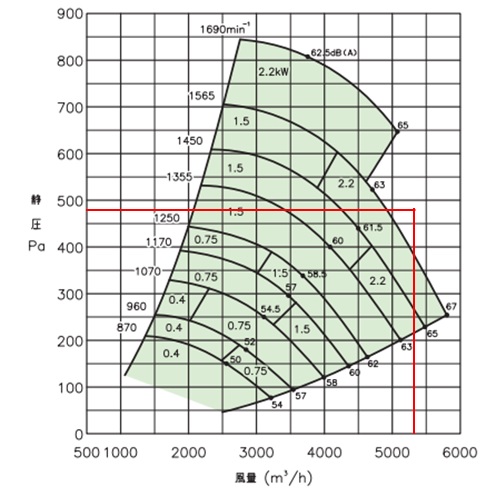 風量と静圧の線が交わった点は2.2kwの範囲に入っているのでモーターは2.2kwとなります。