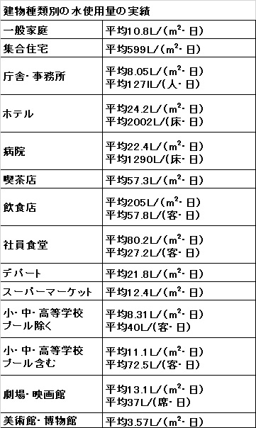 類似の既存施設や既存店舗の過去の給水使用量のデータを参考にすれば、もっともその現場に合致した選定ができるはずであるし受水槽サイズを小さくしたいときなど、水道局との交渉にそのような資料を持っていくと話がまとまりやすいです。