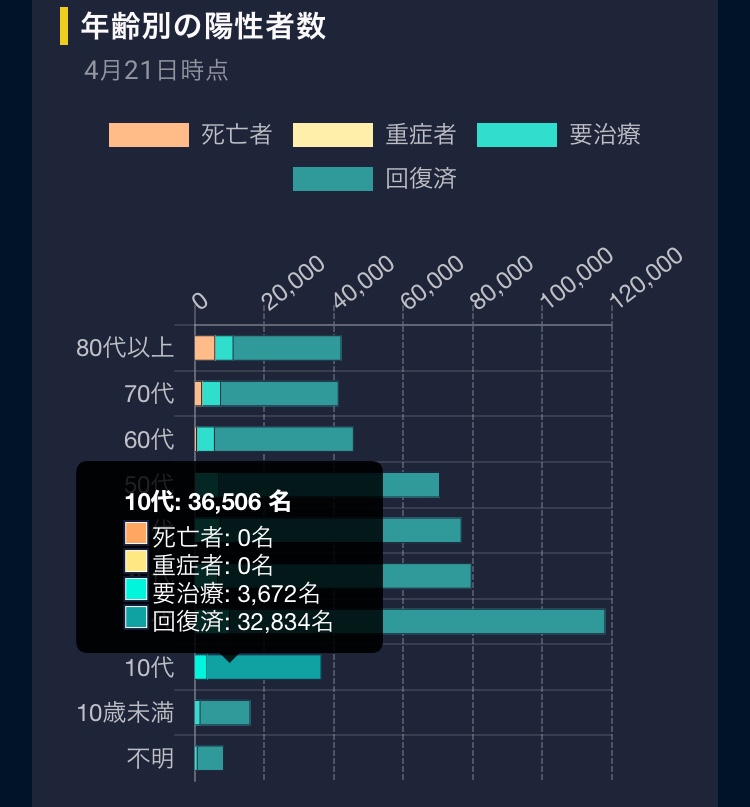 2021年4月21日の時点で日本では0歳から19歳までの子供は1人も亡くなっていません。