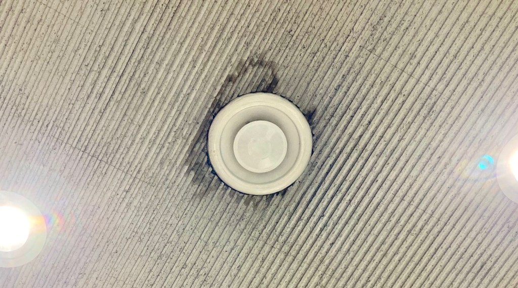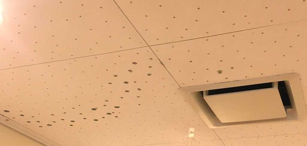 天井内でEAダクトが結露し水分が滴下し、その跡がカビて天井面に出てきたのが下の写真です。