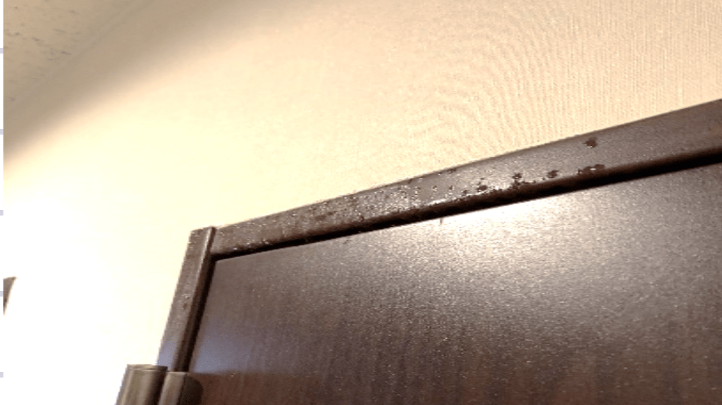 近くに空調吹出口が設置されていて冷やされたスチールドアが結露した様子が下の写真です。