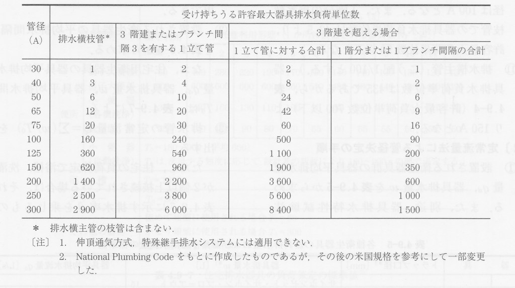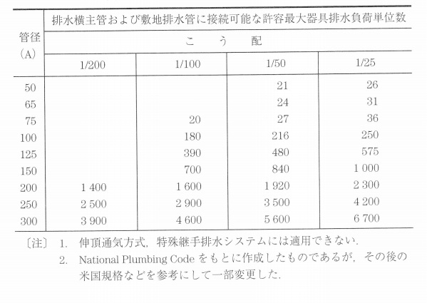 表2:排水枝管および排水立管の許容最大器具排水負荷単位数