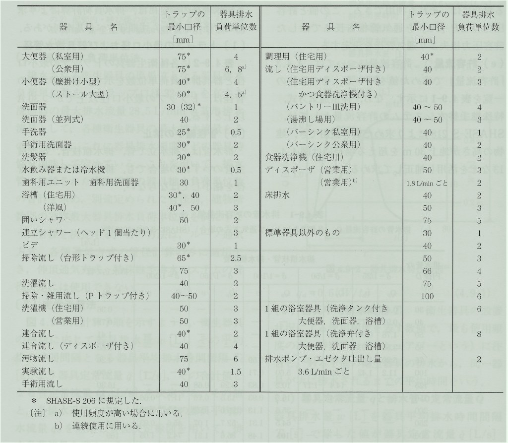 まずは教科書にならって排水負荷単位数から排水管サイズを選定していく方法を以下に示します。