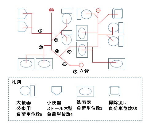 ここでは、図のような衛生器具が配置されたフロアが10フロアの10階建てと仮定して計算していきます。