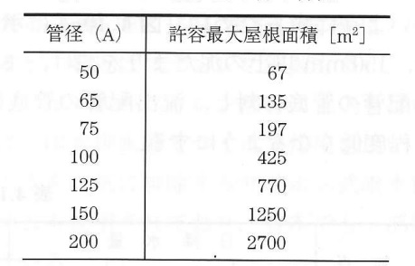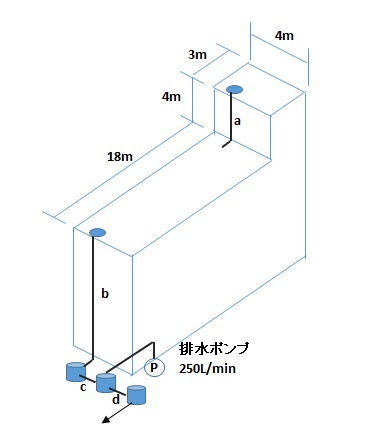 dの配管径: 排水ポンプからの250L/minをどう考えるかですが、この250L/minをいったん雨水を受け持つ屋根面積に逆に換算します。