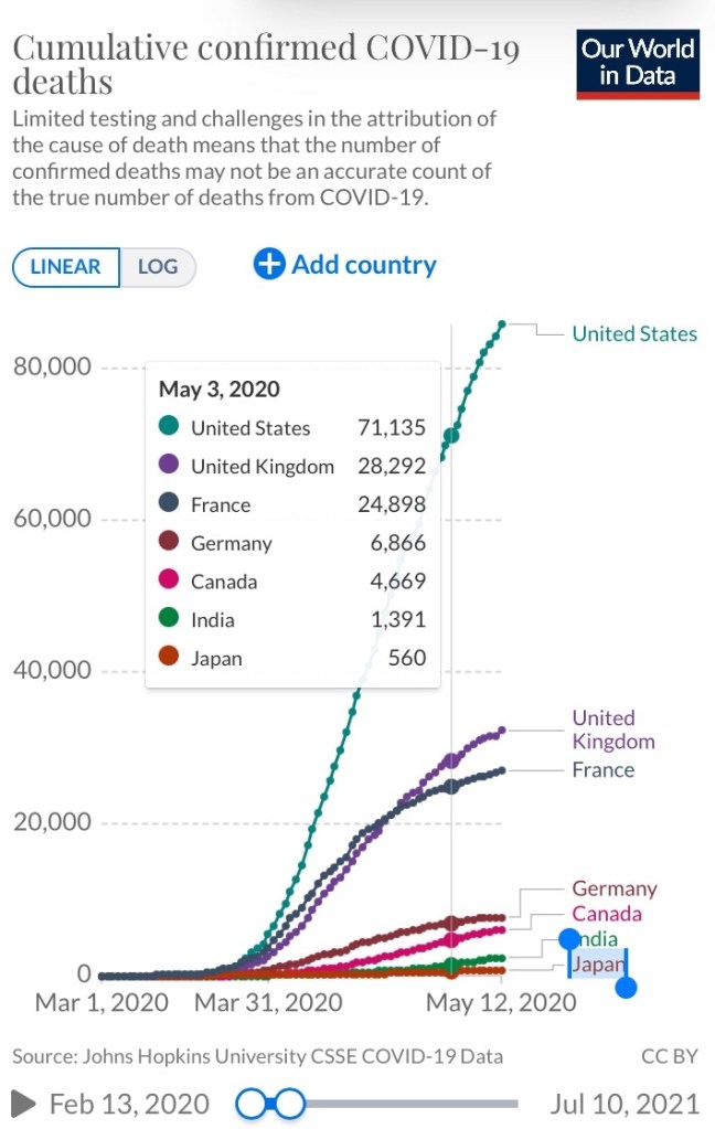 新型コロナで560人の死亡者が出ていたのが昨年、2020年5/3です、下に示した死者数の累計推移で確認できます。