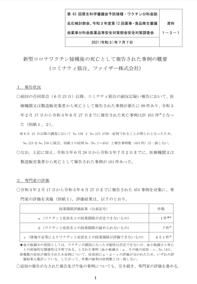 先日、7/7の厚生労働省から発表の新型コロナワクチン副反応疑い報告によると死亡者数は556人に増えています(前回6/23の報告では355人でした)。