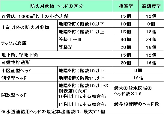 これは防火対象物の種類とヘッドの種類により下の表のようになります。