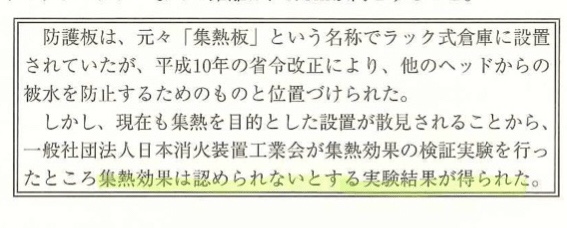 それで昔、消防設備士の試験勉強をした時の問題集H13年版ですが、これも見てみたら、もうすでに集熱板ではなく「ほかのスプリンクラーヘッドから散水された水がかかるのを防止する装置」と書かれていました。