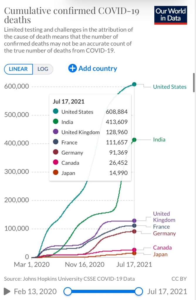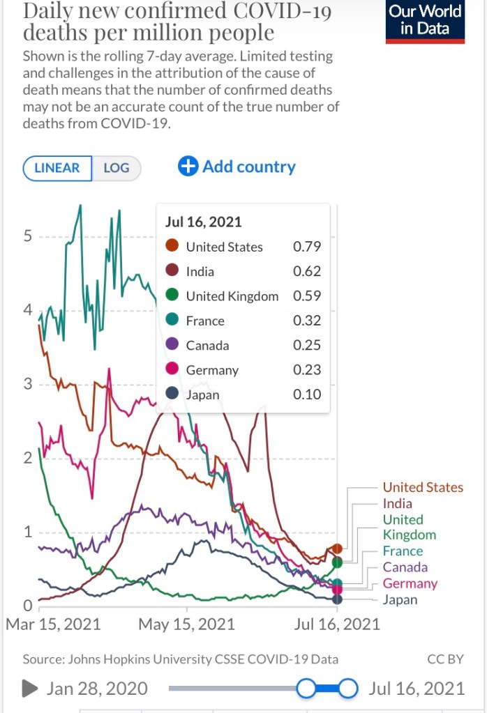 アメリカ人はもう49%の国民にワクチン接種して野球の試合にも観客入れてますと言ってしたり顔でしたが、ワクチン接種率が20%と低い日本はそのアメリカより感染者数も死者数も少ないです。