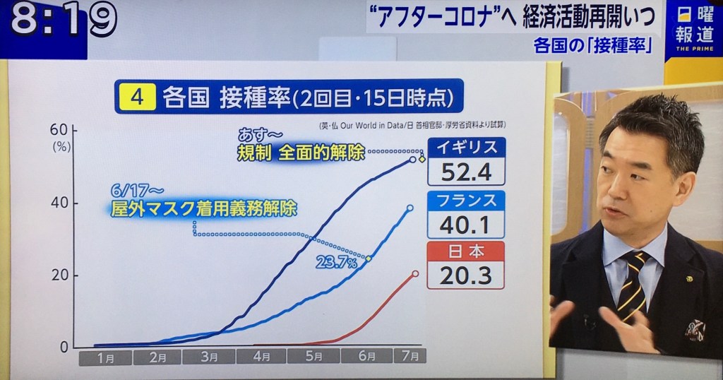 下の画像が日曜報道という番組で接種率を基準に経済活動の再開などを橋本徹が述べている場面ですが、これを見た瞬間に、この人は何を言っているんだ?????