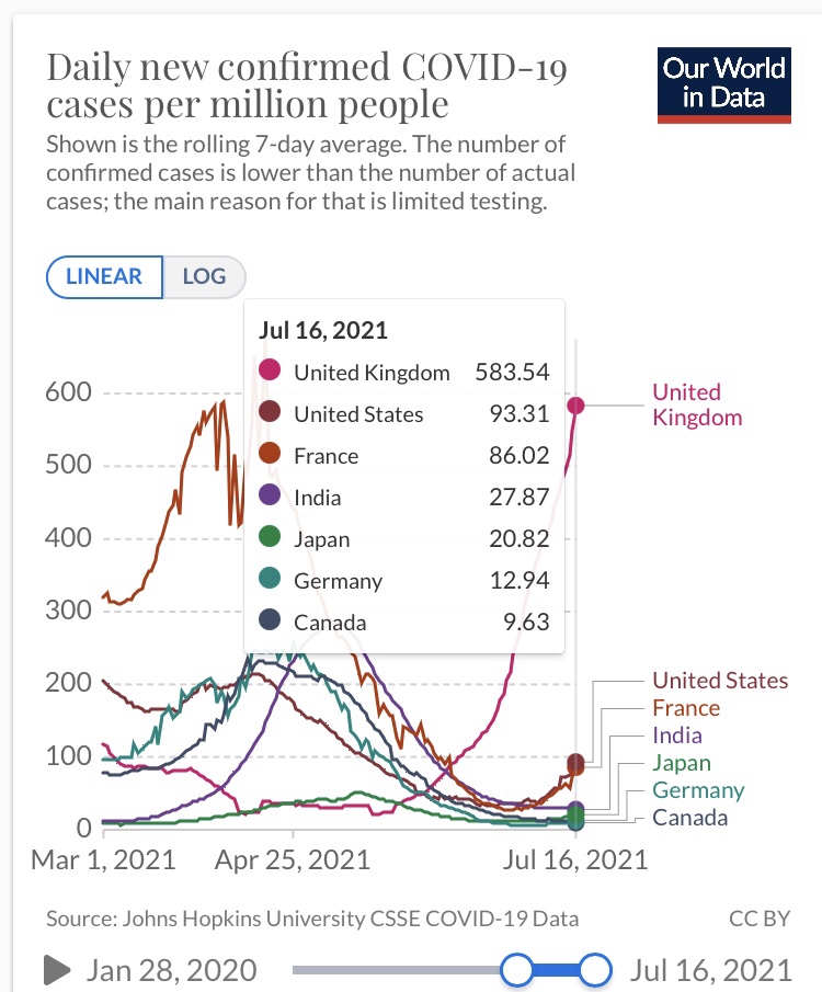 イギリスに関してはボリスジョンソン首相が、ひと通りのでき得る対策はすべてやってみた上で、感染者数は増えているが最近の死者数は抑えられていることもあり、これ以上経済活動を抑制するような政策は意味が無いと判断したからマスクもなし、ほぼ通常通りで経済をまわすという判断をしたまでのことです。
