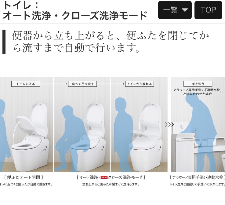感染対策となり得る設備についてですが、最新のPanasonicアラウーノ大便器には便座の蓋を閉じてから洗浄する機能が追加されています。