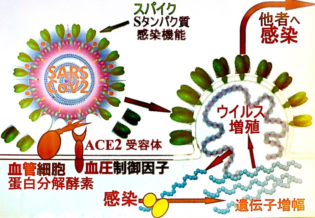 新型コロナウイルスは、体内の腸からACE2受容体によって血管内表面の細胞内に取り込まれてそこでRNA遺伝子コピーを増産します。