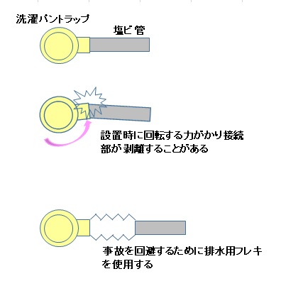 洗濯パントラップの接続を塩ビ管で直つなぎした場合、洗濯パントラップを固定する時に本体が微妙に回転して塩ビ管を差し込んだ接続部が剥離してしまうことがあります。