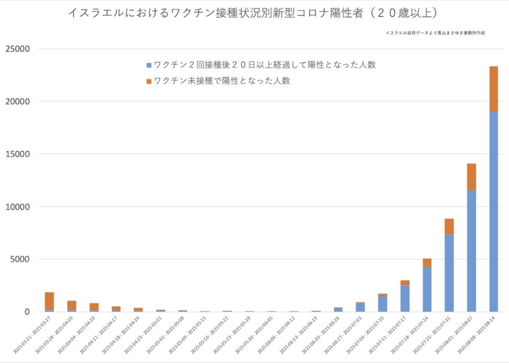 イスラエル政府のデータをもとに青山まさゆき事務所で作成したグラフを引用させていただきましたが、20代以上においてはワクチン接種後の感染者が感染者全体の80%程度に達することが確認できます。