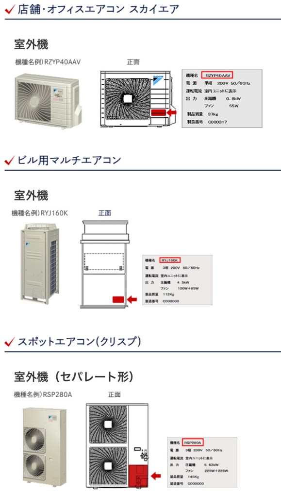 機器品番は室外機については本体表面に貼付されたラベル記載されています。