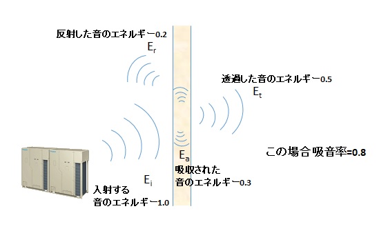 ある材料に入射する音のエネルギーを1.0として、反射した音のエネルギーの割合が0.2だった場合材料に吸収されたエネルギーと透過したエネルギーの合計は0.8、この0.8が吸音率になります。