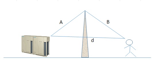 騒音源と影響点との間に遮音壁などを設ける場合の減衰値については騒音源から遮音壁の頂部までの距離A[m]と遮音壁頂部から影響点までの距離B[m]の和と騒音源から影響点までの直線距離d[m]の差が大きいほど大きくなります。