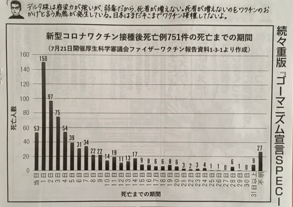 「コロナ論4」で紹介していたワクチン接種後死亡者の接種してからの経過日数と人数をまとめたものをTwitterから拾って紹介しています。