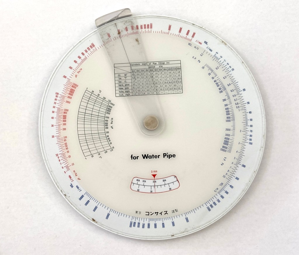 風量と静圧からダクトサイズを検討する場合はダクトメジャーの左側の赤い目盛りを使います。
