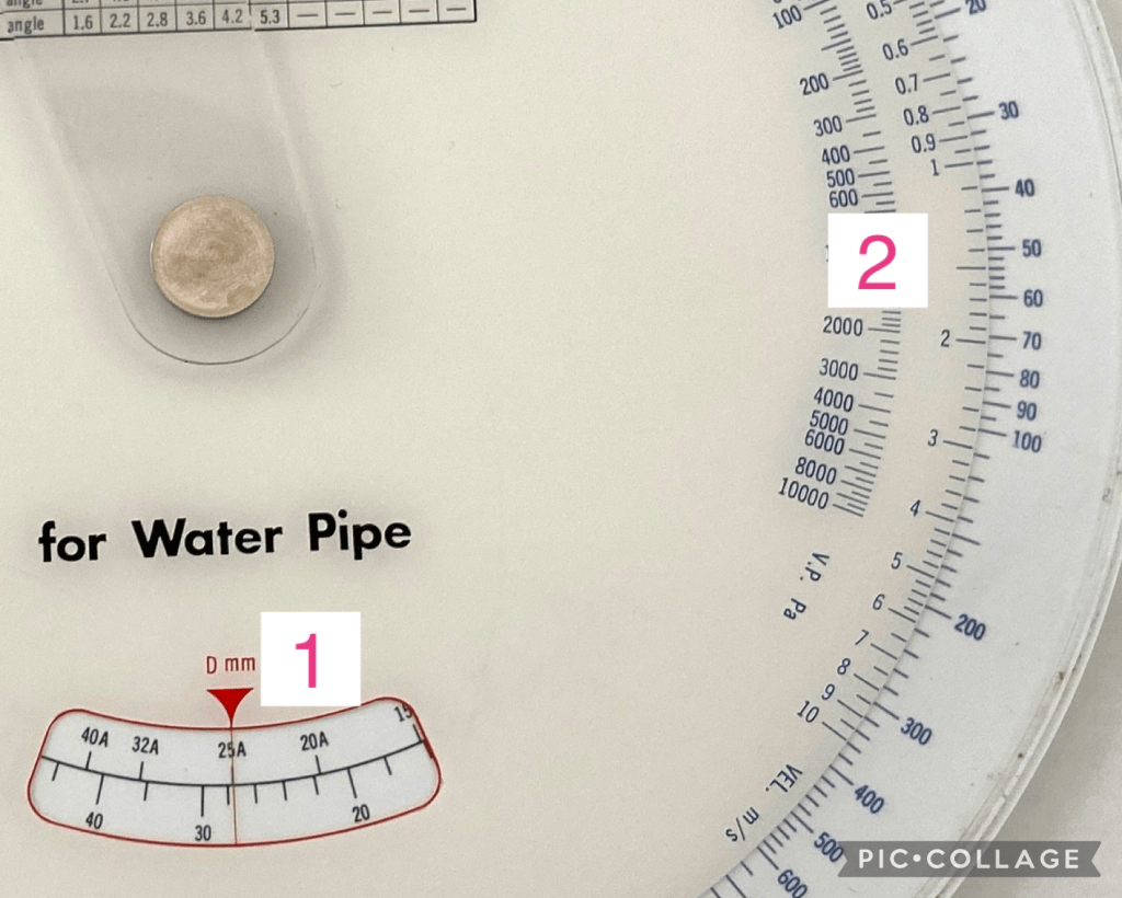 1:真ん中下のゲージの赤線を所定の配管サイズに合わせます、例えば25Aの配管の場合へ25Aでまず合わせます。