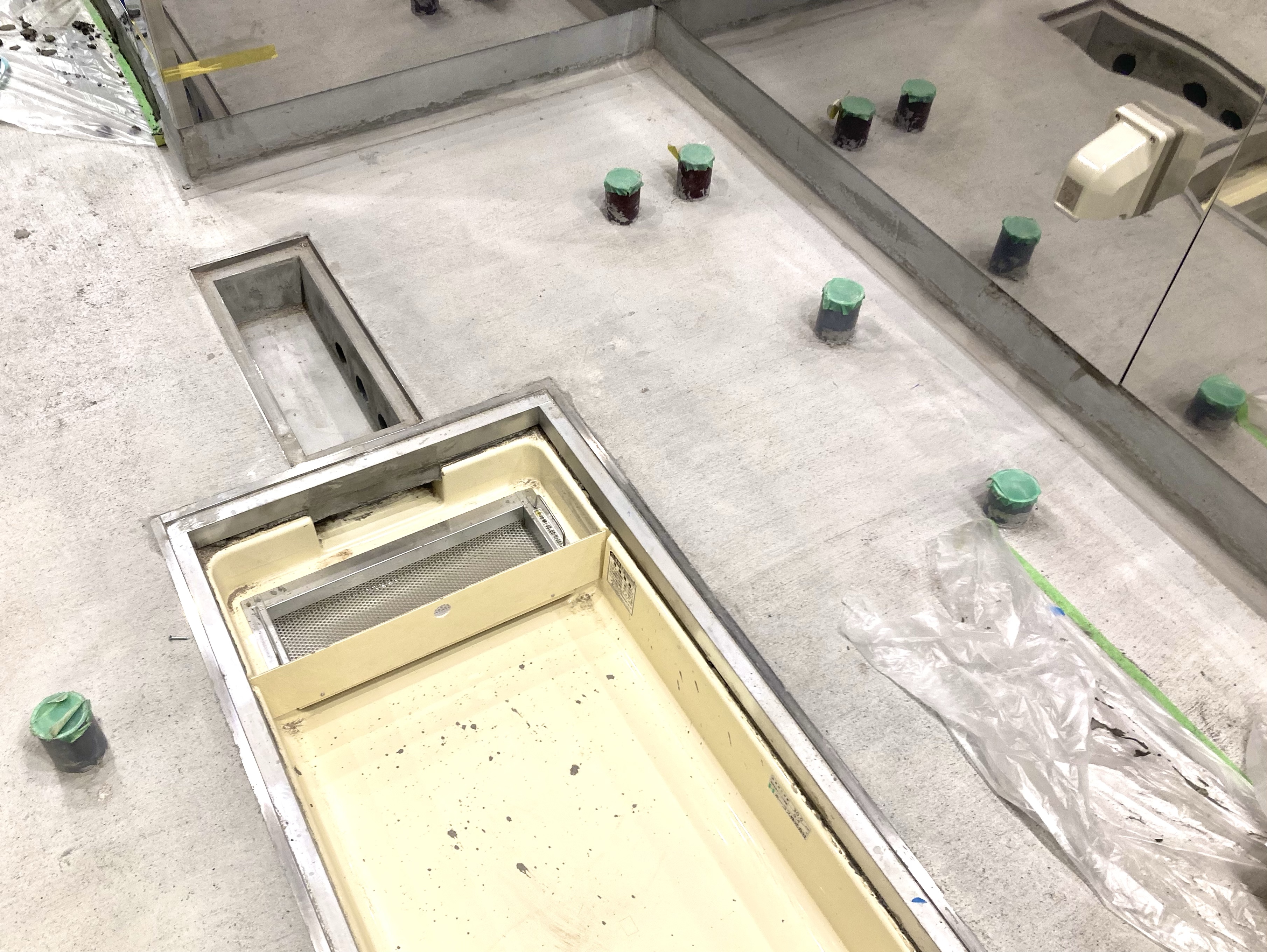 グリーストラップの蓋の上は意外と滑りやすく調理をする人間がその上に立つことになってしまうようなレイアウトはできるだけ避けたいことや、あまりにも大きいものは通路幅に入らないという事態も起きたりします。