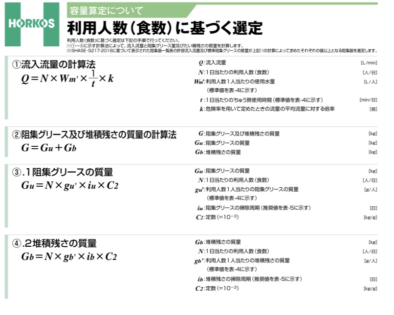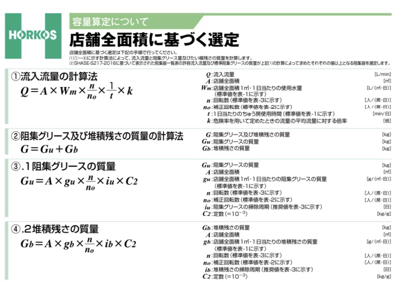 以下、ホーコスのページからのグリーストラップ選定式の抜粋を掲載します。