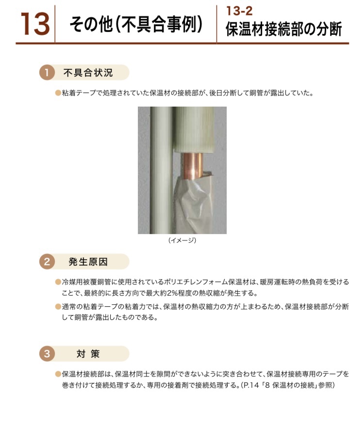 すると、あっさり出てきましたね冷媒配管の断熱材は冬場の断熱時の熱で縮みます、という記載が、まああっさりと出てきました。