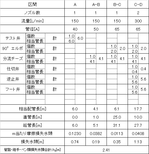 その長さに「配管1mあたりの摩擦損失水頭」の表の数字を掛算すれば損失水頭が出ます。