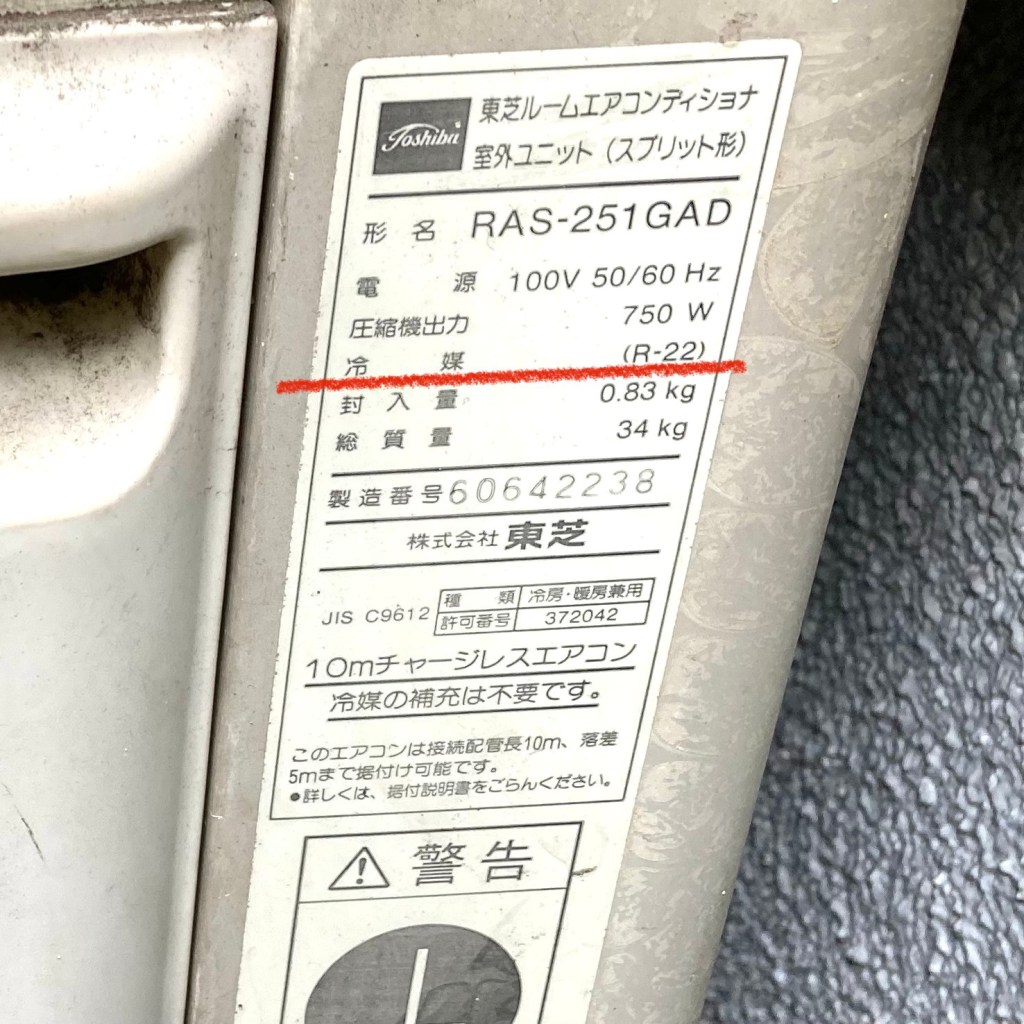 R22は空調機の冷媒として使用されていて、15年以上前の古い空調機でR22が使用されているものが現在も確認できます。感覚的な話になってしまいますが家庭用空調機の2〜3%程度はいまだにR22を使用した空調機が残っているのではないかというくらいの頻度で見かけます。