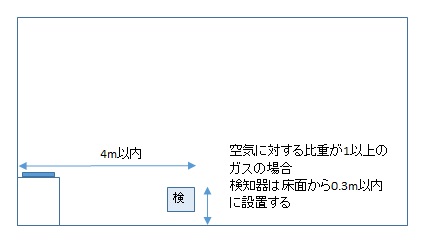 検知器の設置についてですが、空気よりも軽い都市ガスが漏れた場合は上に滞留するので検知器は天井面か、天井面から0.3m以内の壁に設置します。